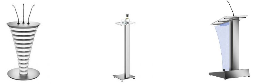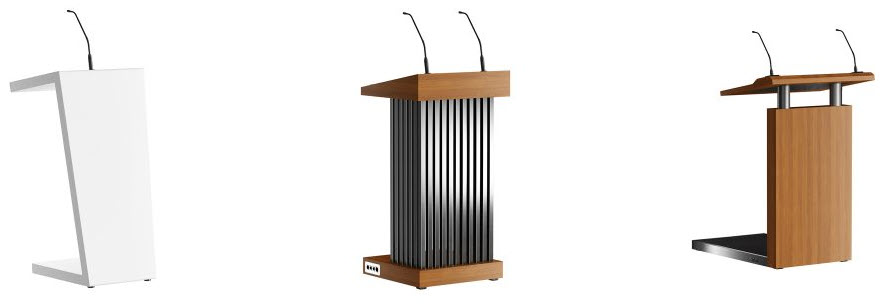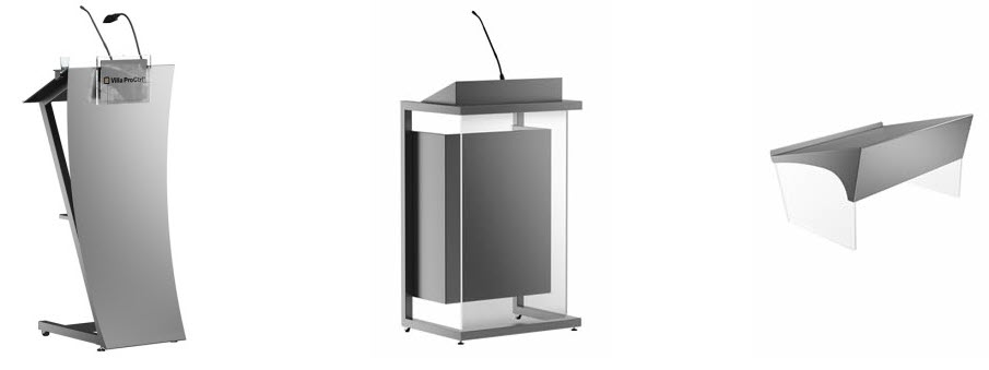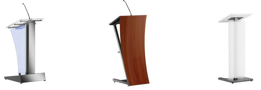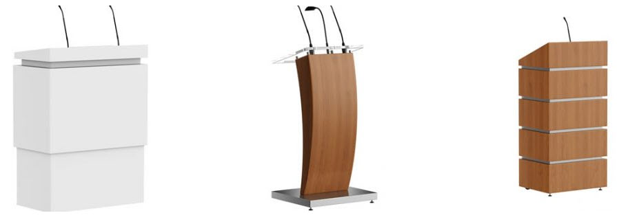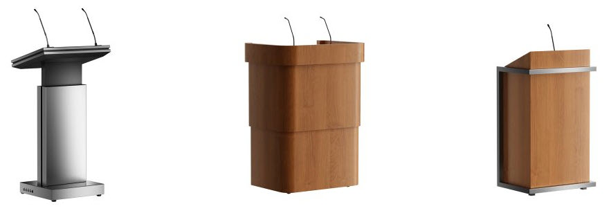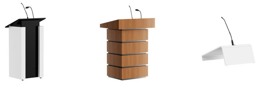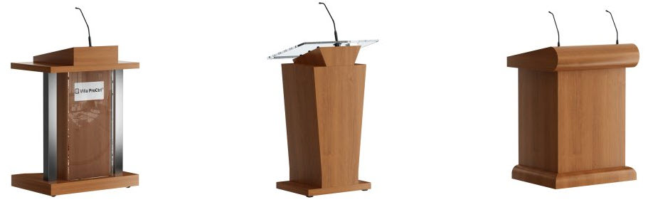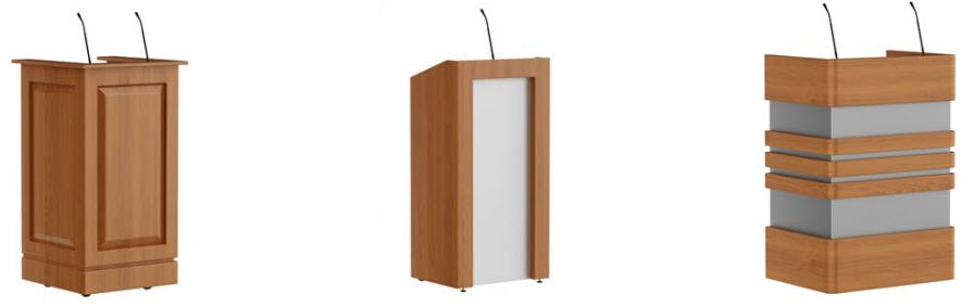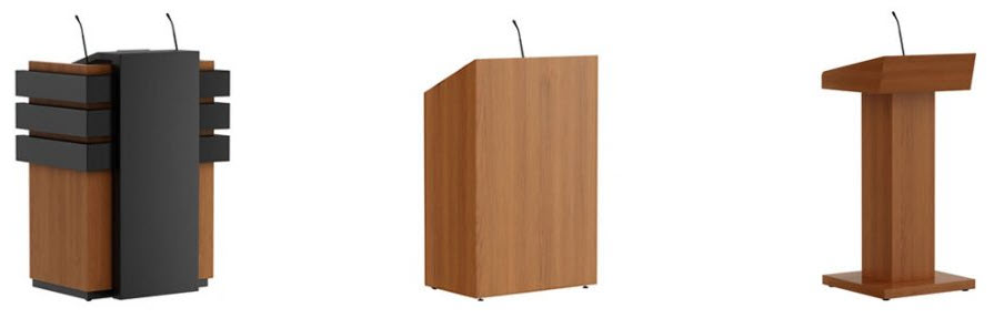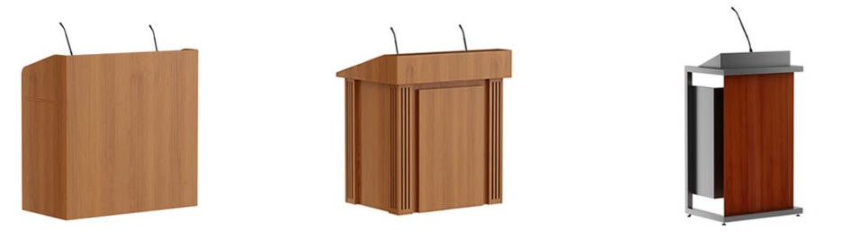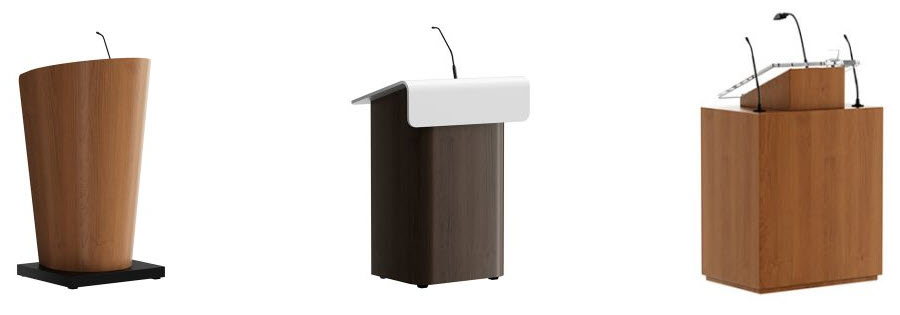 Lecterns and Podiums choices include wood, laminate, and acrylic (and a mixture of each) from "off-the-shelf" options to custom built. Many included audio visual options.